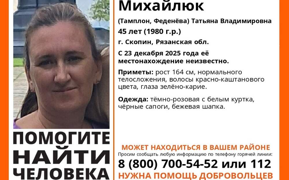 Татьяне Владимировне Михайлюк (Тамплон, Феденевой) 45 лет. Ее ищут с 23 декабря. Рост женщины - 164 сантиметра, телосложение нормальное. У нее каре-зеленые глаза, волосы покрашены в красно-каштановый цвет. Одета была в розовую с белым куртку, бежевую шапку. Обута в сапоги черного цвета. Тех, кто