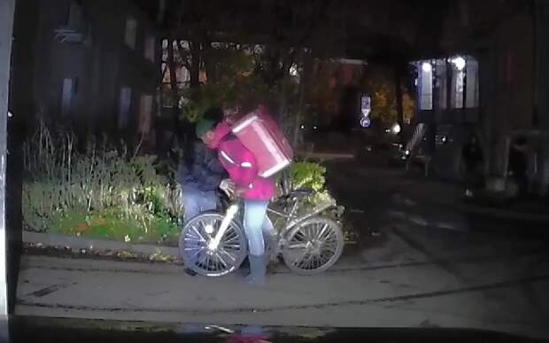 На кадрах видно, что пешеход развернулся, и доставщик, не успев вовремя среагировать, врезался в него. Мужчины разошлись после случившегося.