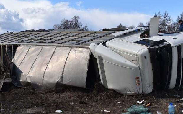 19 марта большегрузный трехъярусный автомобиля DAF улетел в кювет на повороте.