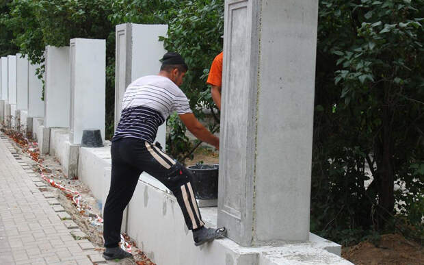Также продолжаются работы по заливке оставшихся столбов ограждения. Рабочие укладывают плитку.