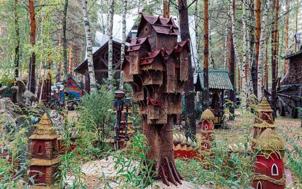Территория усадьбы украшена множеством причудливых фигур. Их создаёт из дерева, бетона и металла семья скульпторов. Источником вдохновения становятся сказки и мифы.