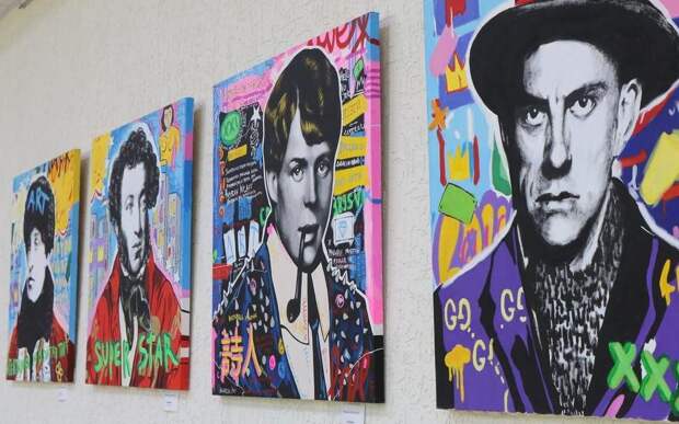 Знакомые каждому портреты известных русский писателей — Сергей Есенин. Анна Ахматова, Николай Гоголь, Михаил Лермонтов и другие — сочетаются с элементами современного искусства. Экспозиция представляет собой часть будущей выставке в творческом пространстве Центральной городской библиотеки имени Есенина.