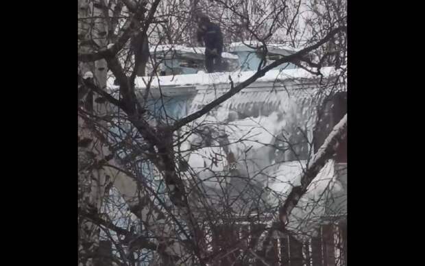 На кадрах видно, что коммунальщики расчищают кровлю. Лопатами они сбрасывают снег на землю с высоты пятиэтажки. В какой-то момент мужчина пытается очистить козырёк балкона, и вся масса снега и льда летит вниз. Глыбой снега выбивает окна в пристройке на первом этаже.
