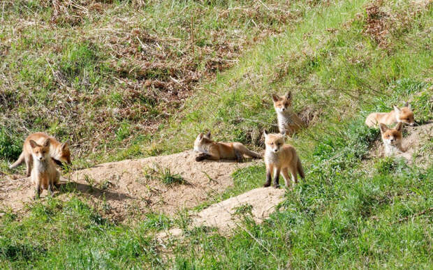 В фотообъектив попали семеро лисят, позже рязанец опубликовал ещё один кадр, на котором, по его предположению, запечатлена мама лисят.