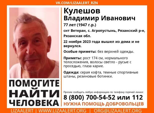 Граждан, обладающих какой-либо информацией о местонахождении рязанца, просят сообщить по телефонам 8-800-700-54-52 или 112.