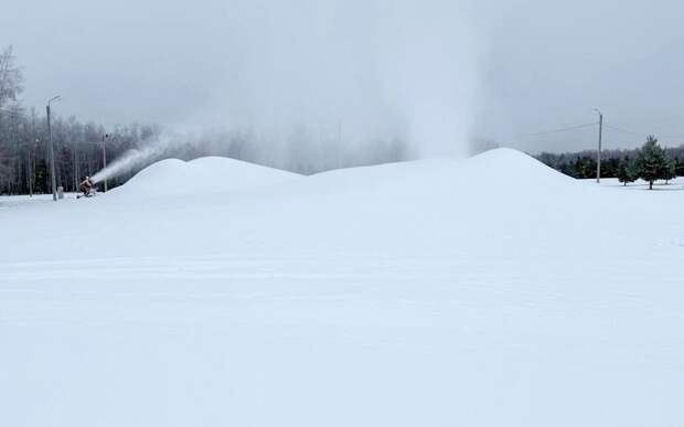 Уже сейчас здесь готовят трассы. Работают снежные пушки – они напыляют покров необходимой толщины, это минимум 40 см. Трамбуют и выравнивают снег ратраки – тяжелые гусеничные машины.