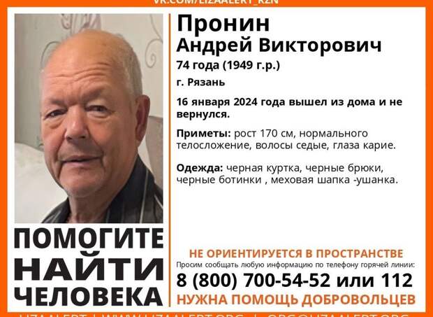 Местонахождения мужчины неизвестно с 16 января 2024 года. Приметы пенсионера: рост 170 сантиметров, нормального телосложения, седые волосы, карие глаза. Был одет в чёрную куртку, чёрные брюки, чёрные ботинки, меховую шапку-ушанку.