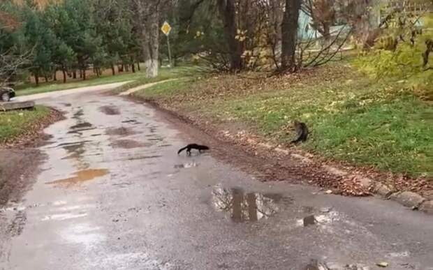 «Чье? Побежала в сторону трехэтажек», – пишет автор. На видео - улица Строителей. Зверёк перебежал дорогу, обнюхал кота, сидящего на обочине, и ушёл.
