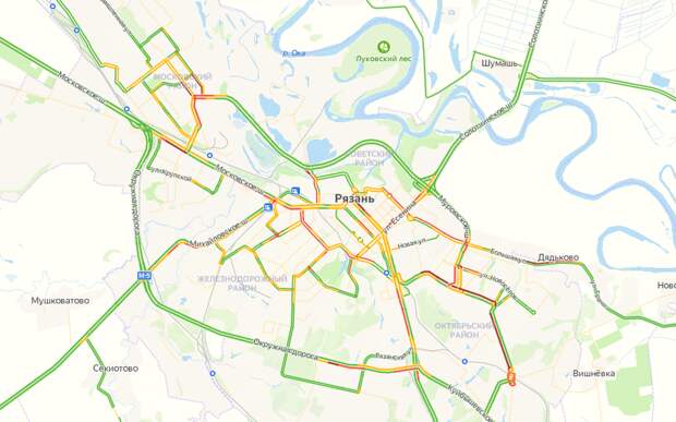 Серьёзно затруднено движение в центре города. Стоит Московское шоссе. Пробка на улице Зубковой, улице Советской армии и на Восточной окружной дороге. Также сложности у водителей могут возникнуть на улице Дзержинского.