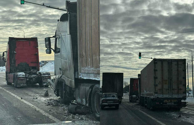 Инцидент произошел в пятницу, 9 февраля, в районе поворота на Горяйново. Столкнулись два большегруза.