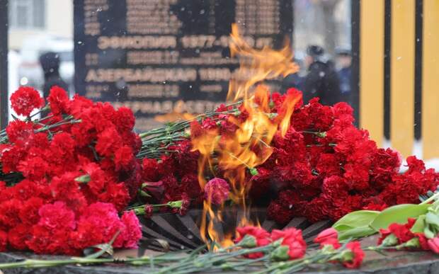 К Вечному огню возложили традиционные алые гвоздики, у памятника в почетном карауле застыли курсанты.