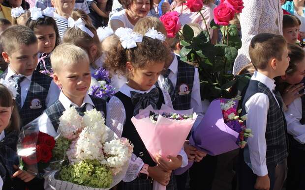 На площадке перед школой - не протолкнуться от учеников. Образовательное учреждение построено в новом районе, и детей действительно много. Букеты цветов, белые банты в полголовы, мальчики в строгих галстучках - главная роль в этот день у первоклассников.
