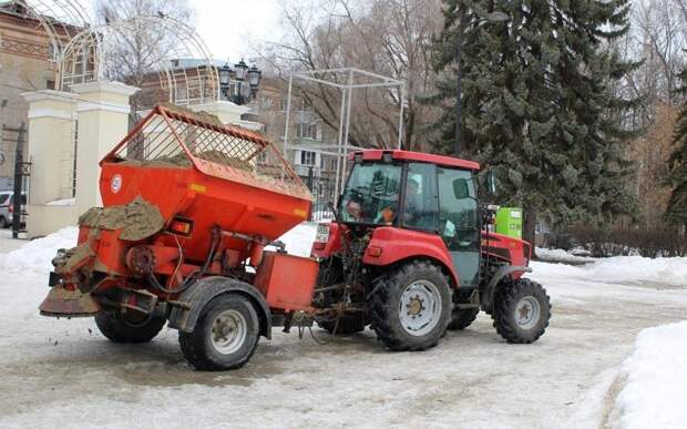 На работу вышли тракторы-щётки, погрузчики и спецтехника для противогололедной обработки.