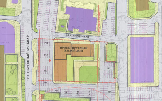 Согласно им, на участке за Дворцом торжеств планируют разместить Г-образную многоэтажку. Также предусмотрена зелёная зона.