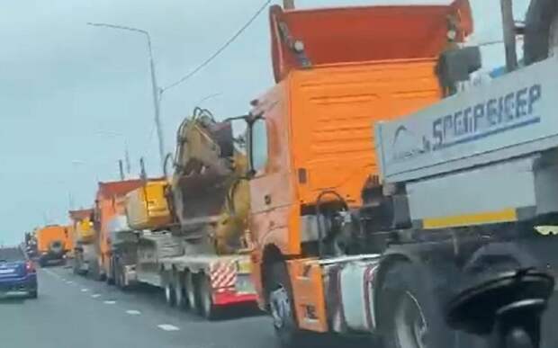 Среди техники можно опознать тракторы, автоцистерны, пожарные машины. Отмечается, что технику заметили на дороге в направлении Солотчи.