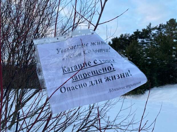 Неподалёку от склона на кустах висит предупреждение: "Катание с горы запрещено! Опасно для жизни". Рязанцы проходят мимо. Многие везут за собой тюбинг.