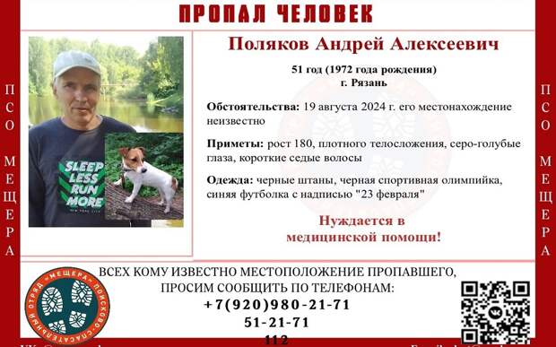 Пропавший - Андрей Алексеевич Поляков, ему 51 год. Рост мужчины - 180 сантиметров, телосложение оценивают как плотное. У рязанца светлые глаза, он седой, коротко стрижен.