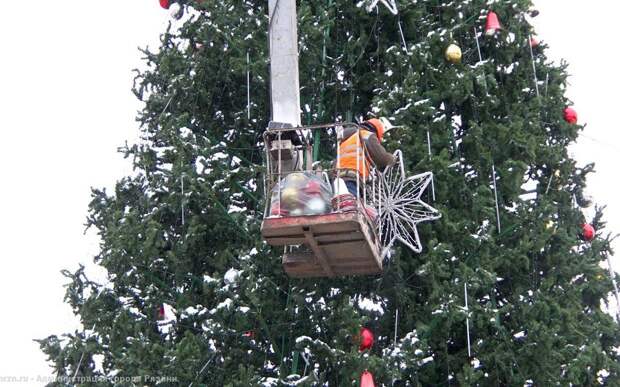 Сначала с елки снимают огромные новогодние игрушки, затем придет черед демонтировать само дерево.