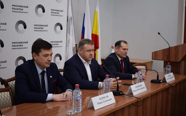 На встрече присутствовали бывший директор Рязанского политеха Игорь Мурог, которого назначили и.о. ректора РГУ, и Ринат Идрисов –врио директора политеха.