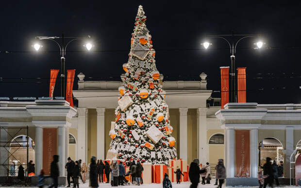 На территории комплекса также красуется главная красавица высотой более 15 метров. Тематика новогоднего убранства – грядущий год семьи.