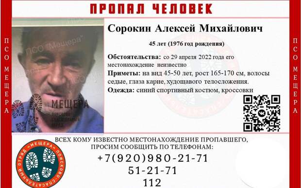Местонахождение мужчины неизвестно с 29 апреля. На вид мужчине 45-50 лет, рост 165-170 сантиметров. Седые волосы, карие глаза и худощавое телосложение. Алексей был одет в синий спортивный костюм и кроссовки.