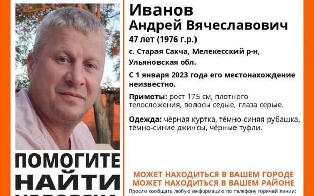 Мужчина пропал 1 января 2023 года в селе Старая Сахча Мелекесского района Ульяновской области.