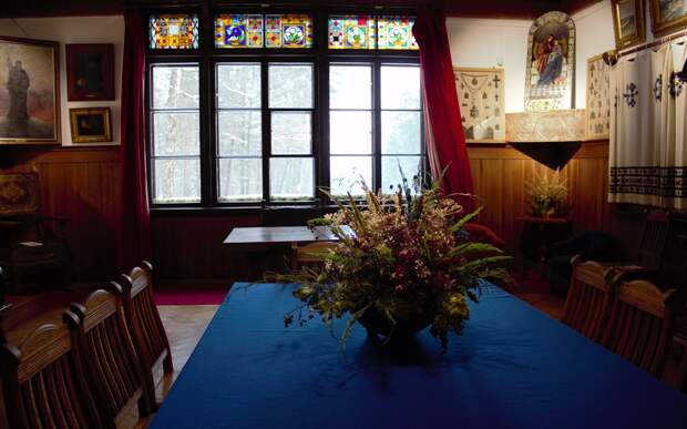 Конечно, все с интересом изучили полотна, принадлежащие кисти Поленова. Многие картины узнавали - ту же "Золотую осень" сразу вспоминают по учебникам. Пейзаж был написан именно в этих местах. Но не меньший энтузиазм вызывают и коллекции, которые собирал художник и его близкие: здесь и найденные в окрестностях кости мамонта, и привезенное Поленовым из Каира чучело крокодила, и купленные им на знаменитой Нижегородской выставке восточные чаши, и собранные по тульским деревням народные вышивки и керамика.