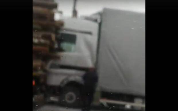 Авария произошла во вторник, 13 декабря, возле деревни Залесное. Судя по кадрам, фура влетела сзади в лесовоз.