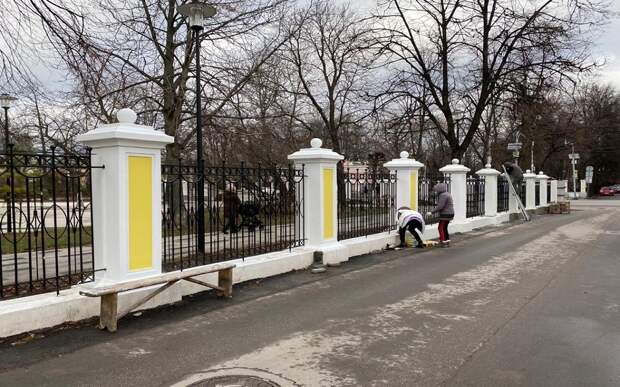 Работы по восстановлению ограждения вышли на финальный этап. Ранее подрядчик выполнил облицовку столбов ограждения с элементами художественного оформления, повторяющих стилистику прежнего.
