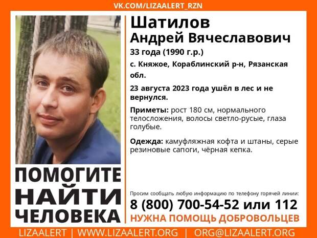 Приметы: рост 180 сантиметров, нормального телосложения, светло-русые волосы, голубые глаза. Был одет в камуфляжную кофту и штаны, серые резиновые сапоги, чёрную кепку.