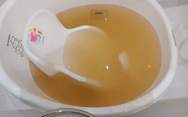 Мужчина сфотографировал детскую ванночку, вода в которой далека от прозрачности. "Пришлось отложить купание ребенка", - прокомментировал он.