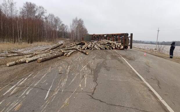 На дороге Сасово-Кадом перевернулся грузовик MAN, он перевозил брёвна. По предварительным данным, водитель не справился с управлением.
