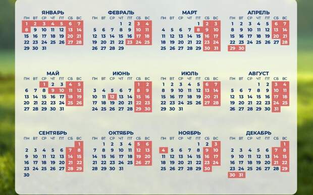 Кроме того, по подготовленному проекту россияне также будут отдыхать с 23 по 25 февраля, с 8 по 10 марта, с 28 апреля по 1 мая, с 9 по 12 мая, 12 июня, с 3 по 4 ноября и с 29 по 31 декабря.