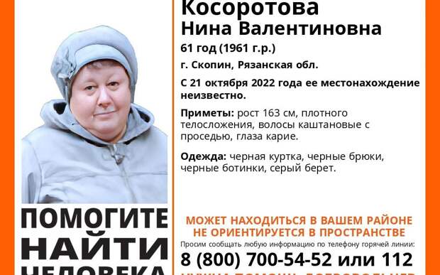 Местонахождение женщины неизвестно с 21 октября. Волонтёры отметили, что пропавшая не ориентируется в пространстве.