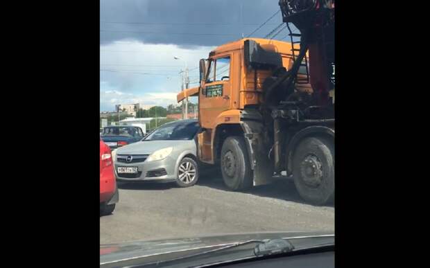 Грузовик столкнулся с легковым авто. Происшествие произошло, судя по фото, в районе проезда Яблочкова. Opel оказался под передними колесами грузовика.