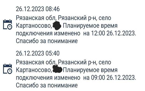 Делятся жители области и сообщениями от "Россетей" - судя по ним, планируемые сроки восстановления электроснабжения постоянно меняются. Так, в Картаносове, по словам одной из жительниц, свет обещают дать лишь 26 декабря к обеду. До вечера вторника предлагают ждать Спасскому району: "Троица - по последнему сообщению от них свет дадут 26.12 в 20:10. У людей разряжены телефоны! Россети постоянно меняют дату планируемого подключения! Никто не дает ответа, когда будет свет! Где бригады, которые якобы круглосуточно работают!".