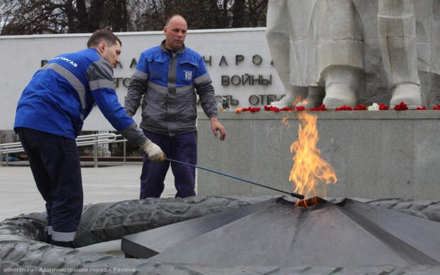 После окончания Вечный огонь зажгли пламенем из горелки.Вечный огонь загорелся на площади Победы в Рязани в 1975 году. Пламя доставили из Москвы, от могилы Неизвестного солдата.