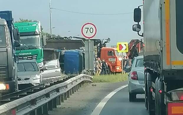 ДТП произошло вечером в четверг, 28 июля. На кадрах видно, что легковушка получила серьёзные механические повреждения, а фура перевернулась на бок. Из неё высыпался песок.