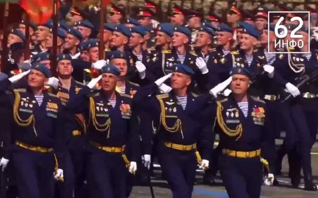 Строй курсантов Рязанского высшего десантного командного училища имени Маргелова возглавил его начальник - гвардии полковник Руслан Евкодимов. Зрителям напомнили, что ВДВ всегда следовали главному девизу - "Никто, кроме нас". Также отметили, что в числе выпускников десантного училища в Рязани - 164 Героя СССР и России.