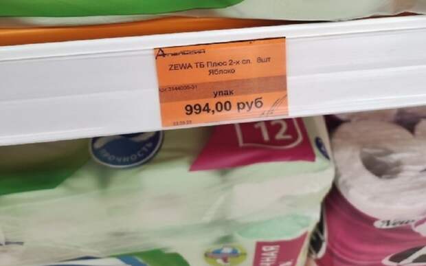 Покупателям предлагают приобрести упаковку двухслойной бумаги марки Zewa из восьми рулонов за 994 рубля. Уточняется, что такие цены на туалетную бумагу рязанец увидел в магазине «Апельсин» на улице Новаторов.