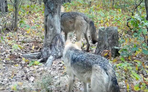 На ролике двое волков обнюхивают сосну, об которую ещё недавно чесался кабан.