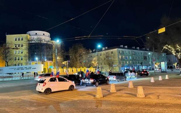 Вечером во вторник, 15 марта, на площади Победы собрались автомобилисты с российскими флагами. Во время сбора из машин звучали патриотические песни.