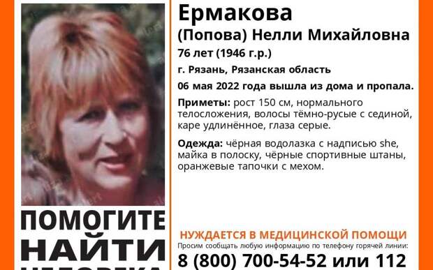 Отмечается, что женщина вышла из дома 6 мая. С тех пор ее местонахождение неизвестно. В сообщении говорится, что женщина нуждается в медпомощи.