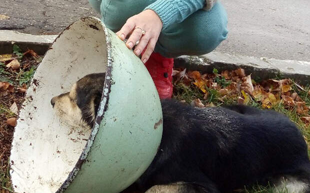 Спасатели разрезали и отогнули края конуса металлическими ножницами. Собаку освободили и накормили.