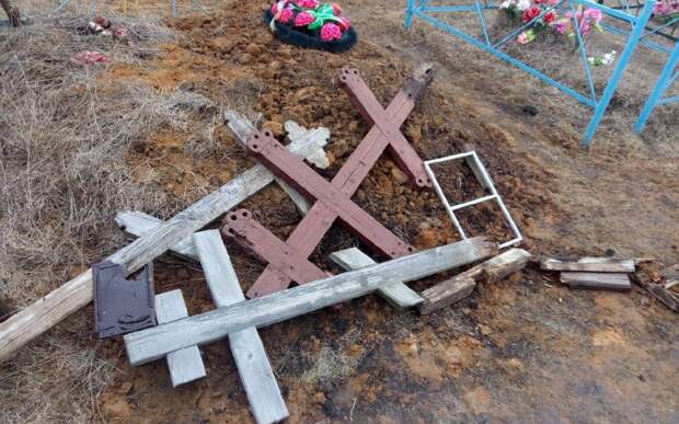 Вандалы где-то свалили памятники и кресты, где-то разбили о мраморные плиты бутылки. Деревянные кресты они сломали у основания, вырвали из могил и расставили по периметру кладбища.