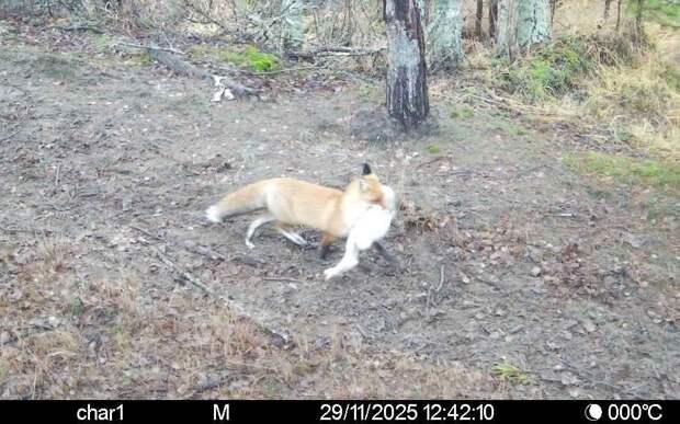 Фотоловушка на территории Окского заповедника сняла редкий кадр: лиса поймала зайца-беляка и несла его в зубах к месту приема пищи.