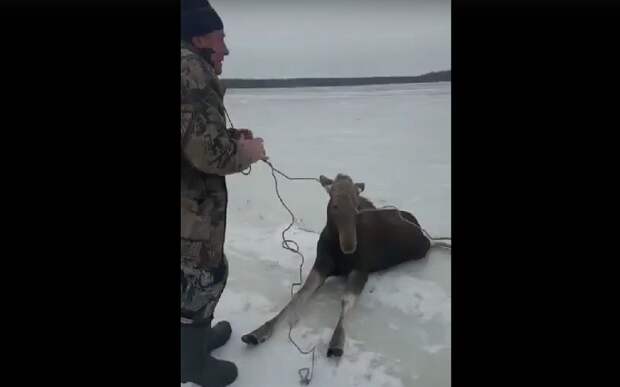 Происшествие произошло на одном из водоемов у села Макеево. Маленький лось скользил на льду и никак не мог добраться до берега. Заметившие его мужчины пришли на помощь – животное спасали с помощью веревок.