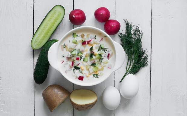 Те, кто считает каждую калорию (или просто лишается аппетита в жару), могут попробовать лёгкую овощную окрошку. Набор овощей можно разнообразить – например, исключить картошку, добавив вместо неё сельдерей или молодую репку. Изобилие зелени тоже придётся кстати – можно нарезать целый пучок укропа, петрушки, зелёного лука и кинзы. До вкуса окрошку доводят, добавив растертый с ложечкой горчицы яичный желток.