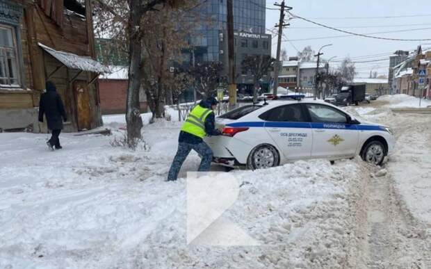 В субботу, 16 декабря, в центре Рязани засняли машину Госавтоинспекции, которая застряла на нечищеной дороге.
