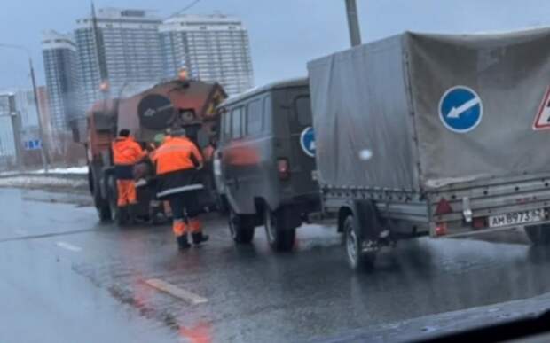 Так, на Северной окружной решили залатать ямы прямо с лужами. Мокрый асфальт и пасмурная погода — это не препятствие для ликвидации выбоин.